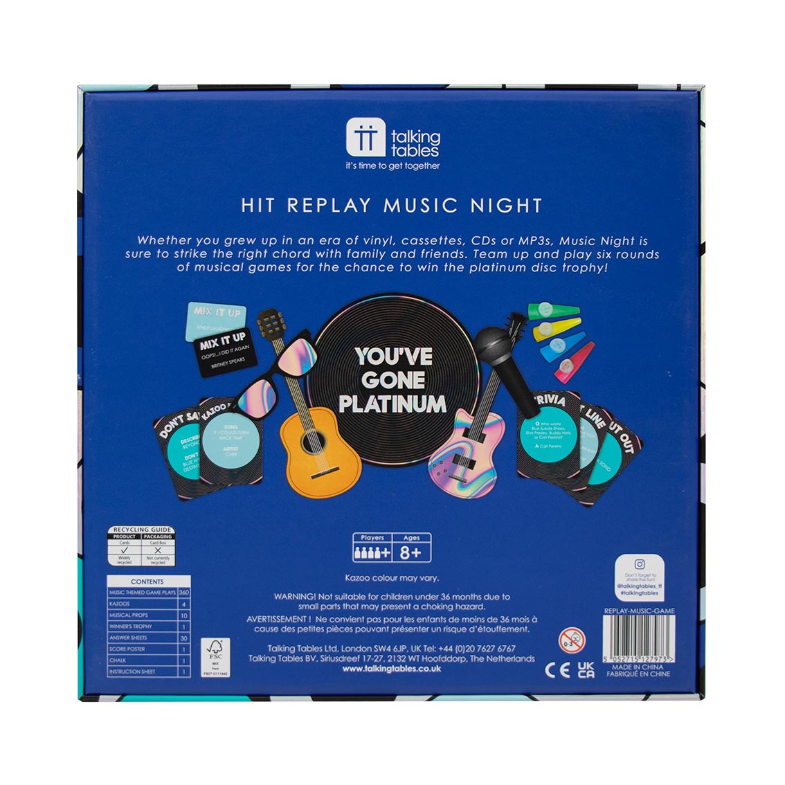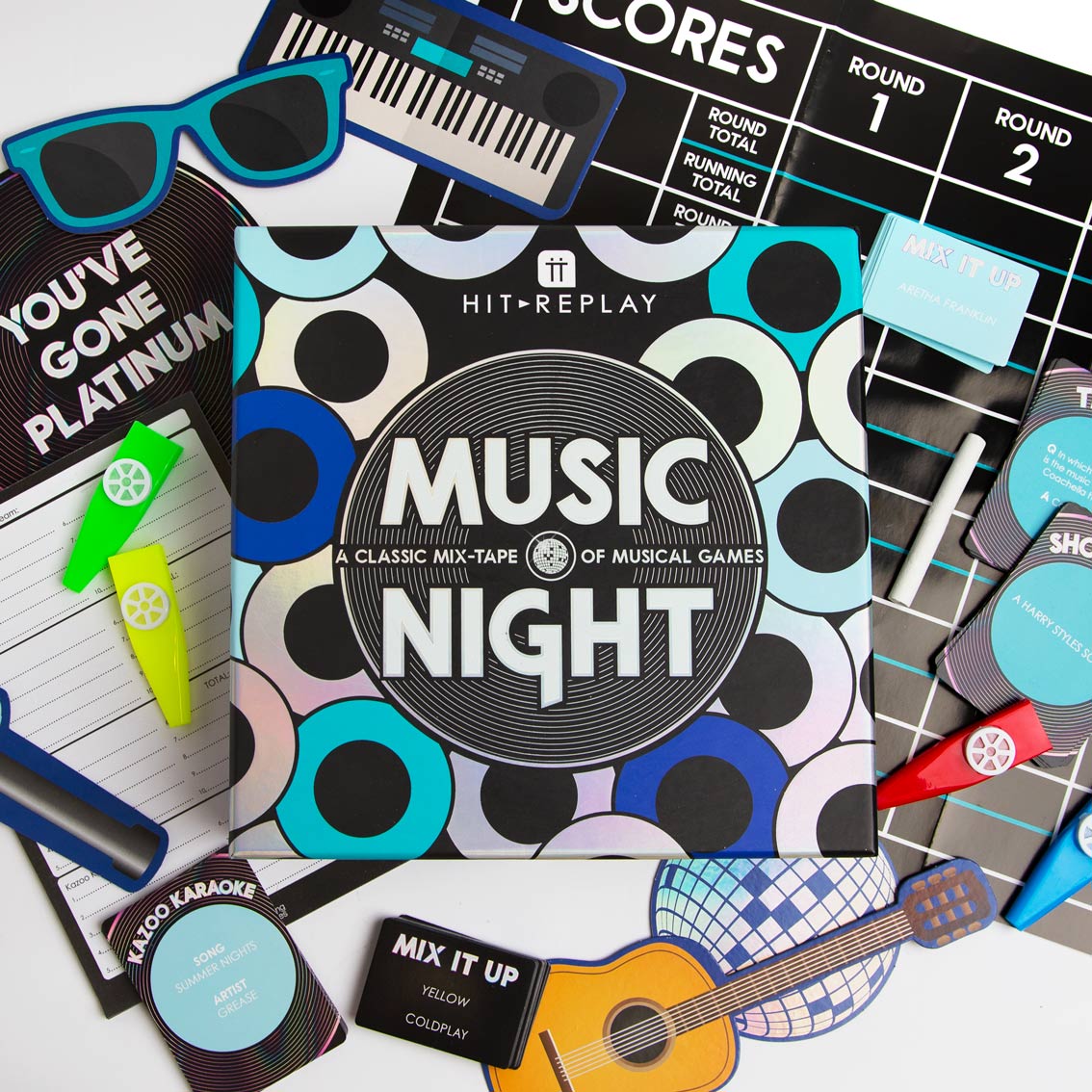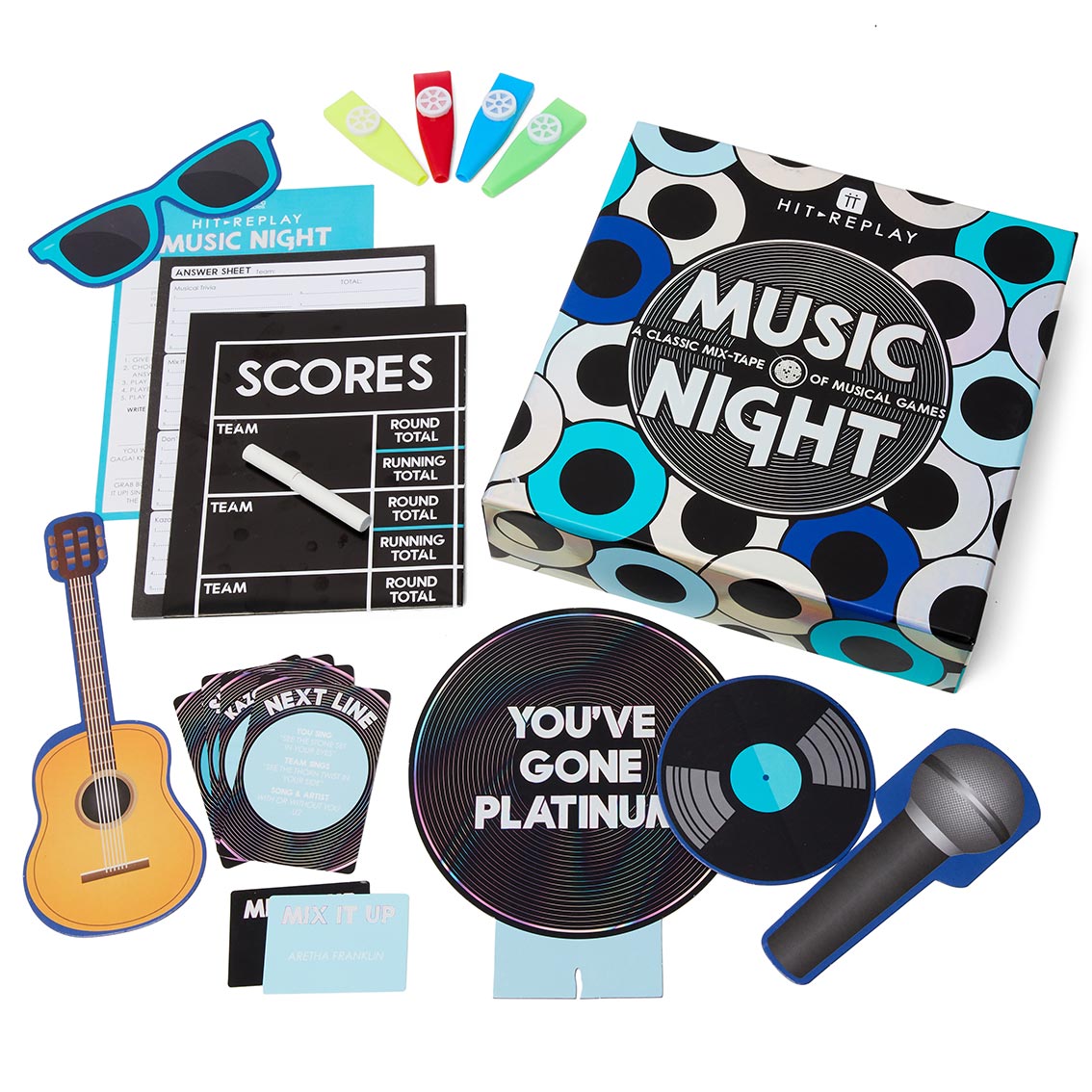 Sing your heart out with this fun Music Night Game by Talking Tables. Whether you grew up in an era of vinyl, cassettes, CDs or MP3s this music game is sure to test your musical knowledge and bring out your competitive streak! Team up and play this compilation of six music themed games for the chance to win the platinum record trophy! Perfect for an evening of loud, musical fun with family and friends.