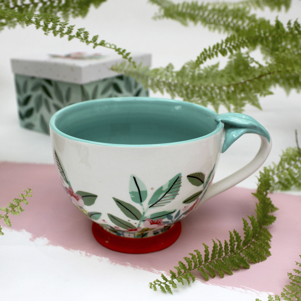 Large tea cup shaped mug illustrated with flowers and foliage.