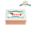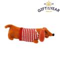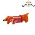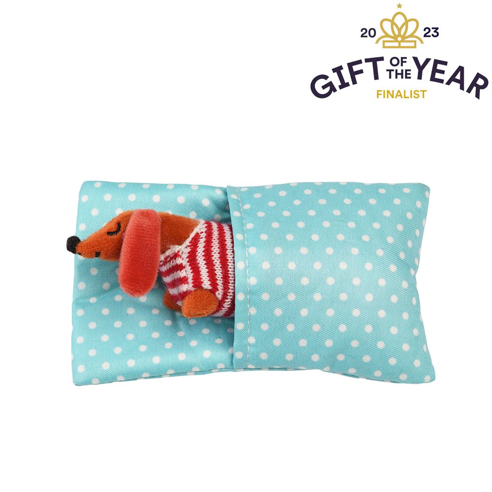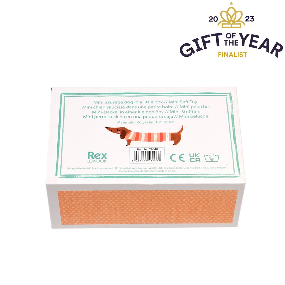 A cute miniature soft toy of a sausage dog wearing a striped jumper. Comes with a polka dot blanket, tucked up inside an illustrated gift box.