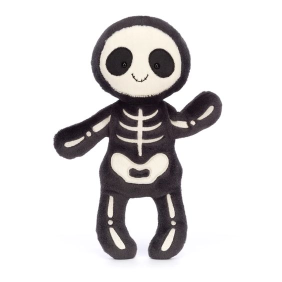 Skeleton Bob is a 33cm soft toy, he is super soft and squishy, made of soft black plush with plush cream fabric face and hips, his ribs and limb bones are embroidered. He has shiny black safety eyes set in those big eye sockets and a stitched smile. Part bean filled for that lovely cuddly feel and weight.