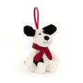 The Bashful Puppy Decoration is a perfect gift for Christmas! Our soft patch puppy has gorgeous cream fur with inky splashes, and charming floppy ears. With a red knit scarf and textured ribbon, this little dog can be fixed to the tree, or ...