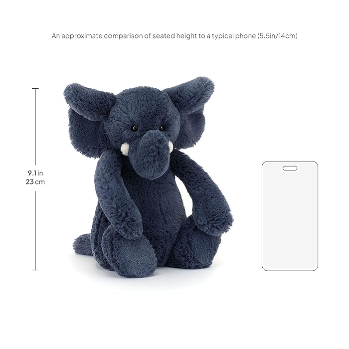 Bashful Elephant has soft midnight blue fur, large fan-shaped ears, and long trunk adorned with two small white tusks, will quickly become a favourite companion for little ones.