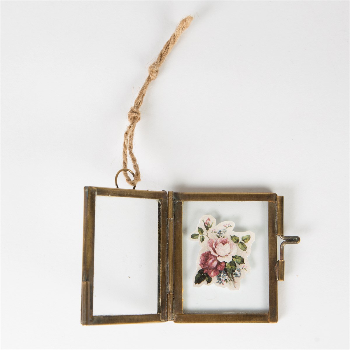 For a lovely little touch of the vintage chic look, this min brass finish frame is perfect. The frame is made out of metal and glass and features delicate little rose pictures sandwiched between the two panes of glass which make up this charming little miniature.