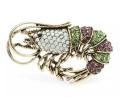 Beautiful shrimp brooch in gold coloured metal with white, lilac and green rhinestones.