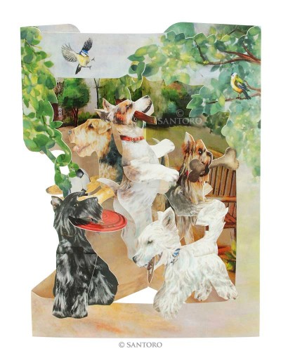 Swing Cards This 3D paper sculpture features terriers playing Frisbee, catching bones and collecting sticks! The artistic design and soft hued illustration is just a delight, making it the perfect greeting for animal lovers and dog enthusiasts!