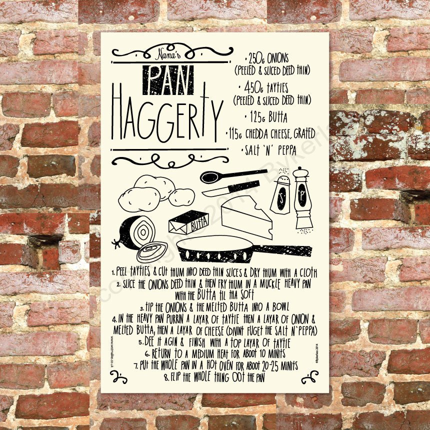Pan Haggerty North East Recipe Tea Towel Using a family recipe from the Geordie Mugs Co. designer's Nana, this is the way she made Pan Haggerty (without meat). A lovely recipe tea towel written using a North East dialect. Text includes w...
