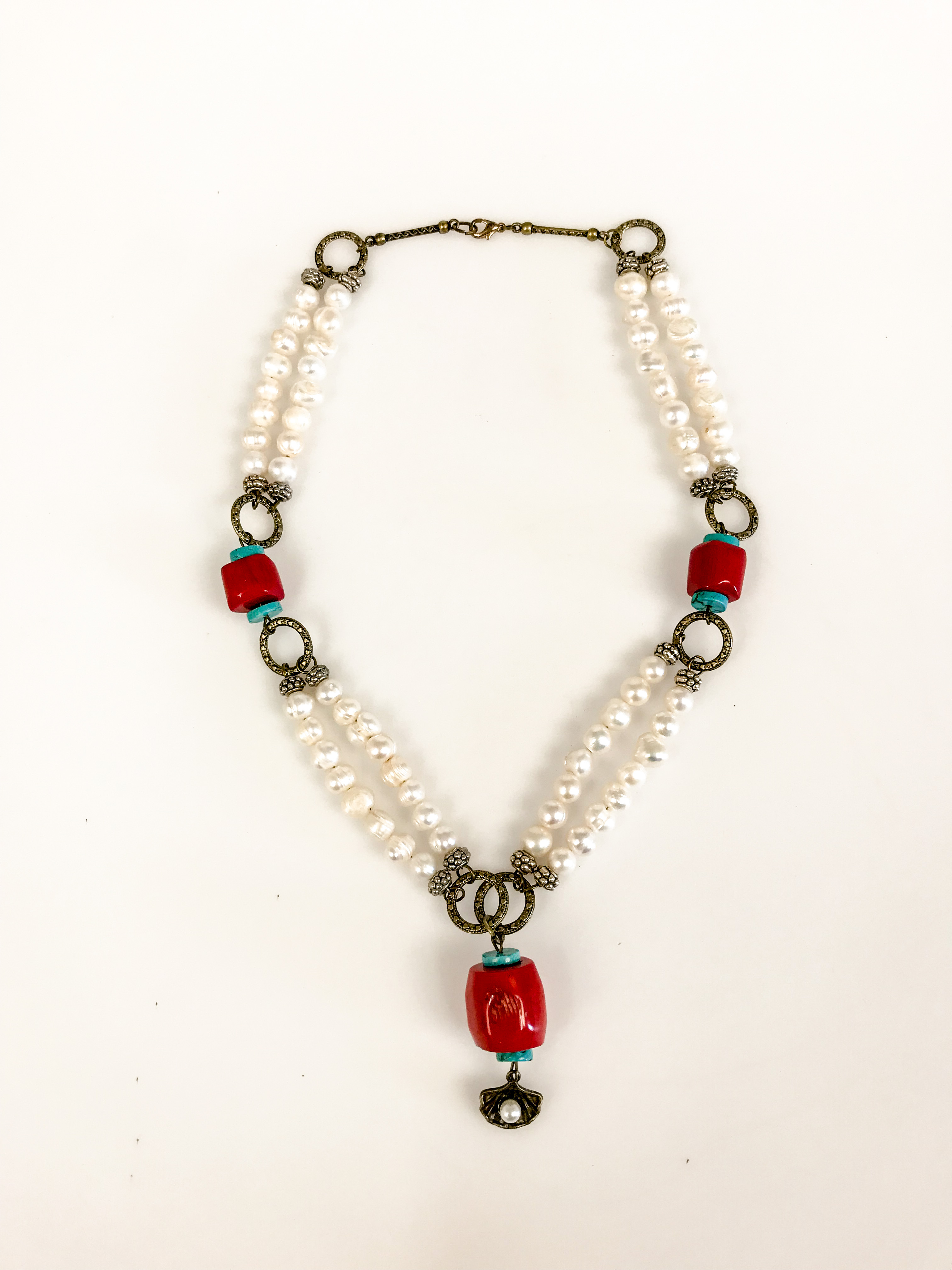 Hand made by Lizzi at ‘Bradleys’, this necklace is made of fresh water pearls, farmed coral beads and turquoise. It has antique bronze coloured findings