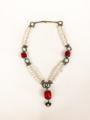 Hand made by Lizzi at ‘Bradleys’, this necklace is made of fresh water pearls, farmed coral beads and turquoise. It has antique bronze coloured findings