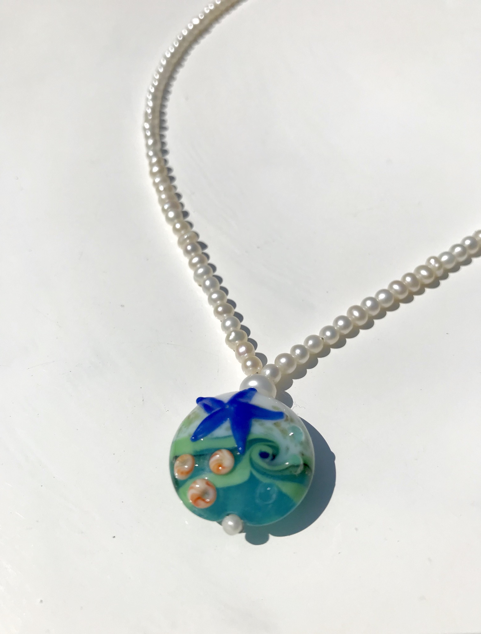 Beautiful beachcomber hand made necklace with white freshwater pearls. Inspired by the seaside and the ocean with a glass bead that has a wave shape, starfish and tiny sea urchins.