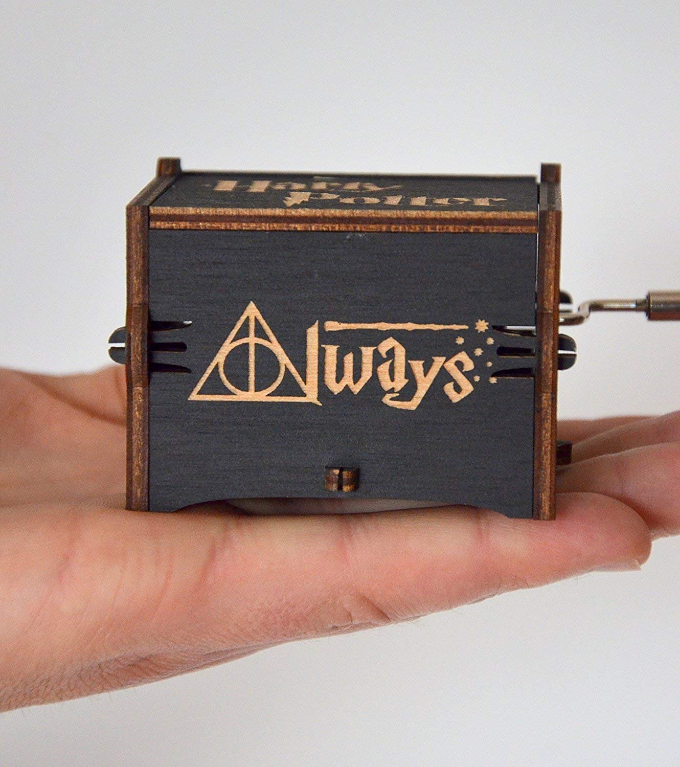 Beautifully crafted wooden musical box decorated with intricate designs and with a lid. Just turn the handle and listen to the Harry Potter theme tune. Perfect gift for any fan of the films.