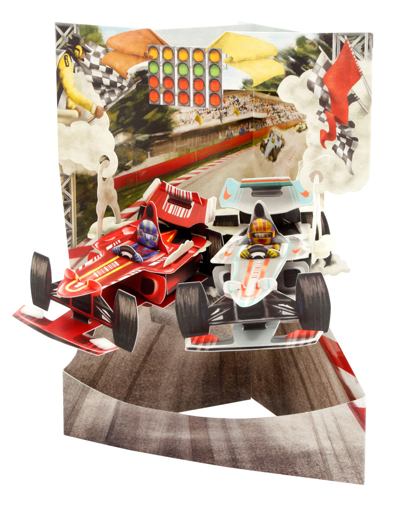 Need for speed? The race is on with this exciting 3D pop-up! In vivid shades of crimson, jet black and fossil grey, this interactive Swing Card features two cars battling it out on the track. Sure to thrill motor enthusiasts and aspiring racers; ready, set, go!