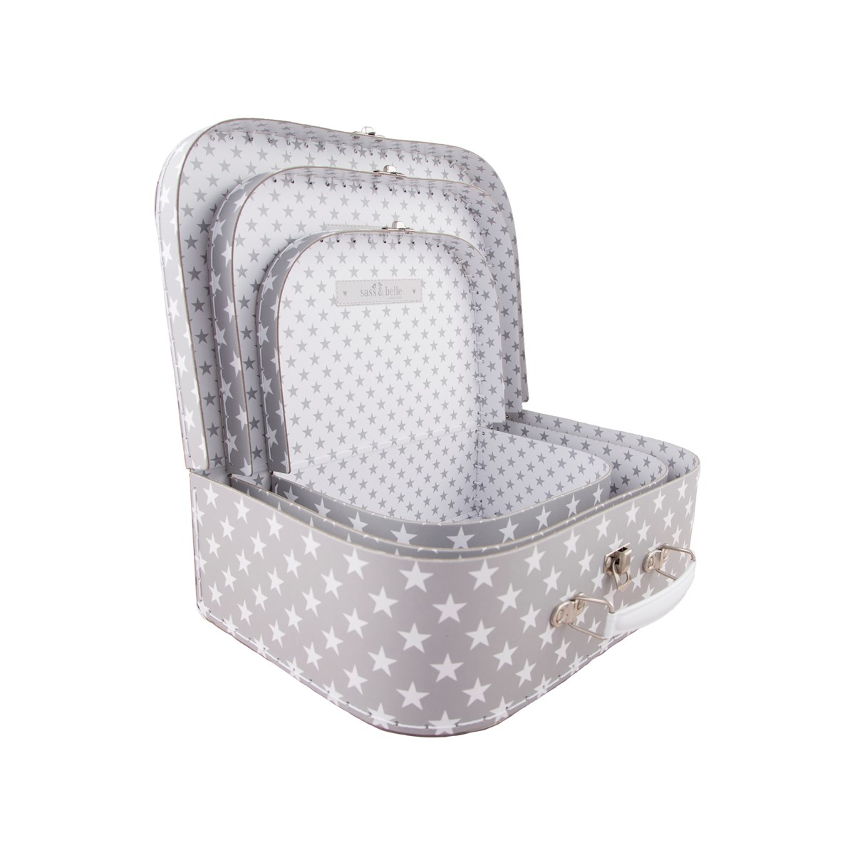 This 'Nordic Star' set of 3 suitcases are from Sass and Belle. They are grey with white stars and fit inside each other. Perfect storage for a kids room to tidy away all those precious little things or for a work room. Also good for a festive display at Christmas time.