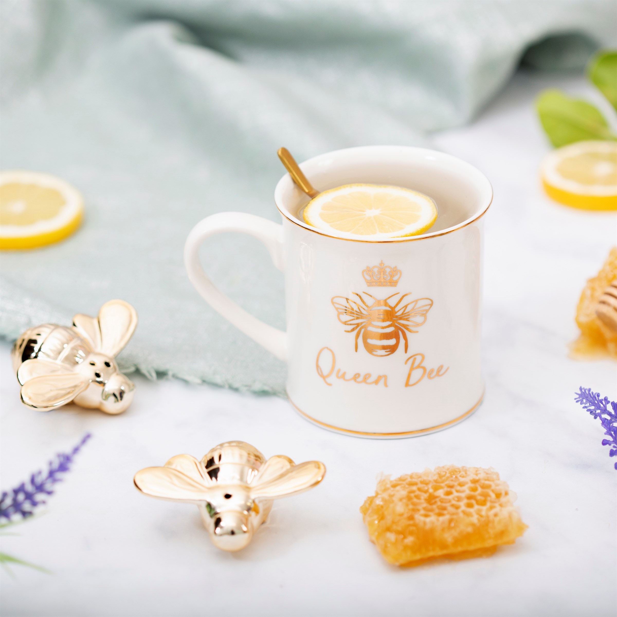 This Queen Bee mug from Sass and Belle is a lovely shaped mug, sturdy and comfortable. It has 'Queen Bee' in gold on a white background.