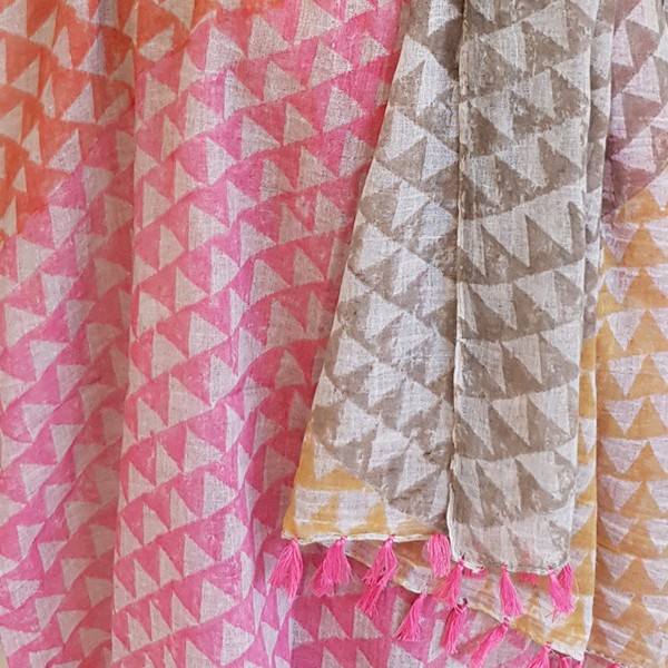 Beautiful scarf in warm tones. Following aged old block printing traditional methods. Simple triangle stamps form stylish graphic patterns in toning colours; finished with red tassle ends.