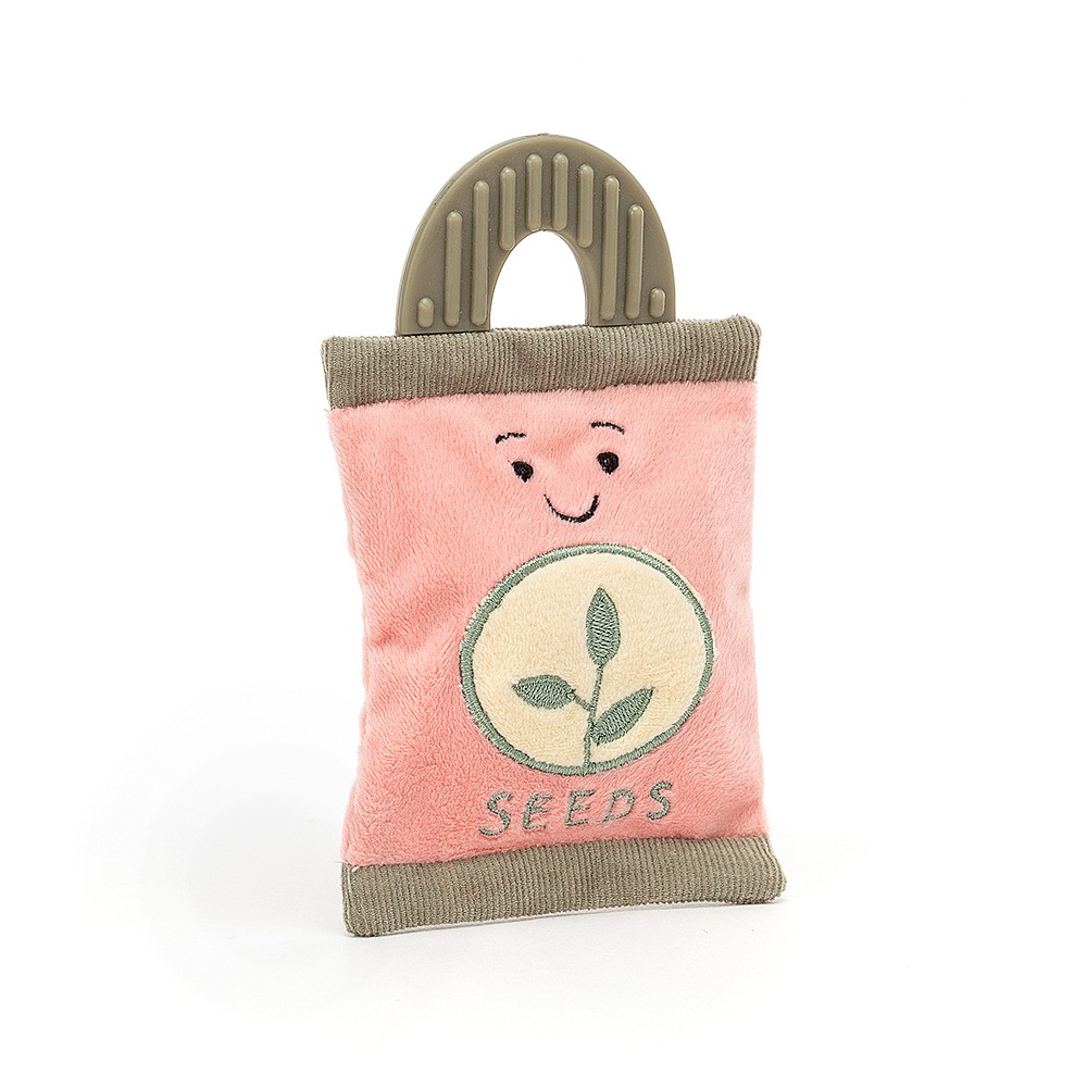 This little teether rattle has a peachy pink fur pouch and brown cordy edges. There is stiched detail in green and the ctust little smiley face! There is a teething ring handle, a rattle and crinkles and actually feels like there are seed...