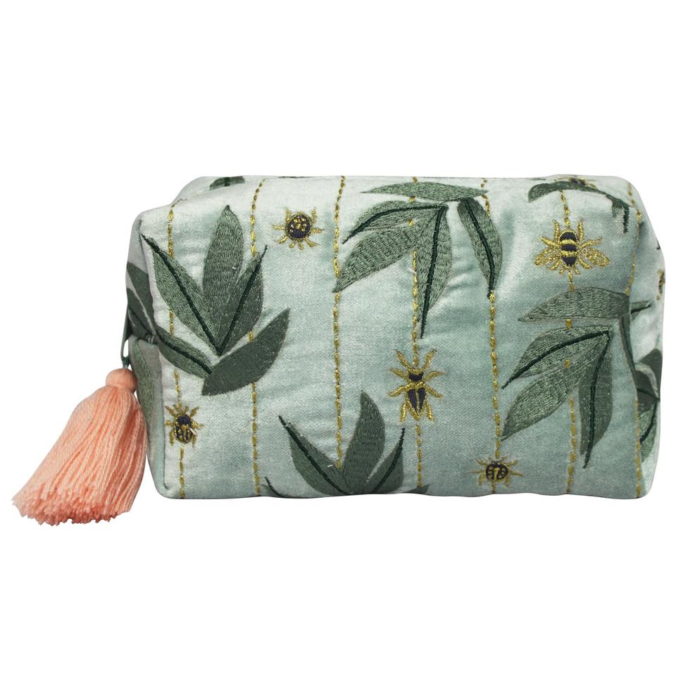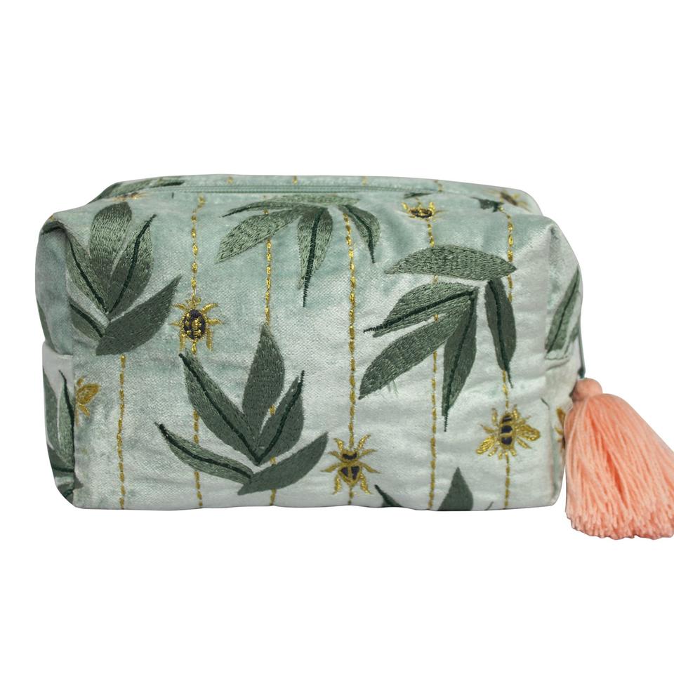 A luxurious sage green box shaped pouch with embroidered leaves and gold bees and beetles. Opens with blush pink woollen zip tassle.