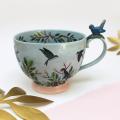 Large tea cup shaped mug illustrated with blossoming trees and swooping swallows.