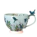 Large tea cup shaped mug illustrated with blossoming trees and swooping swallows.