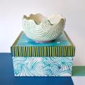 Blue-surf patterned bowl, with gold foil detailing between the waves. Eat up all your breakfast to discover the turtle inside. Arrives safe in a beautifully designed gift box, that is fully lined. Great for dressing table storage or o...