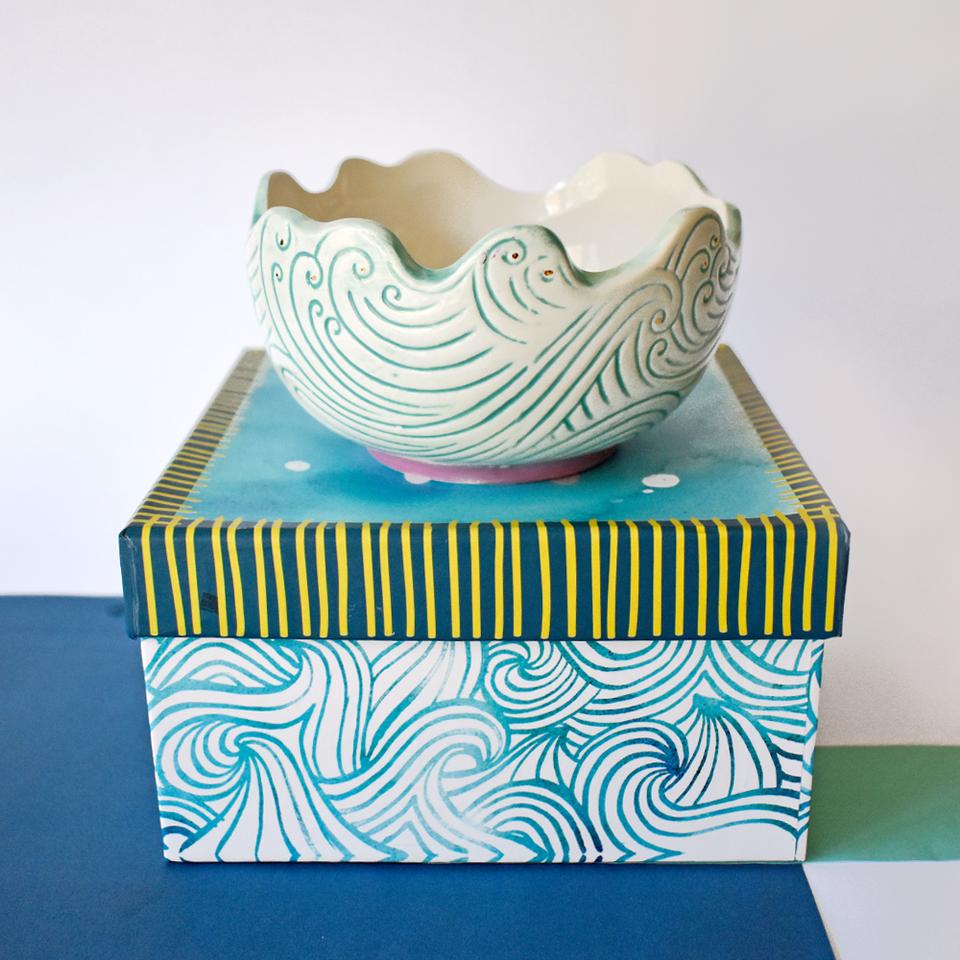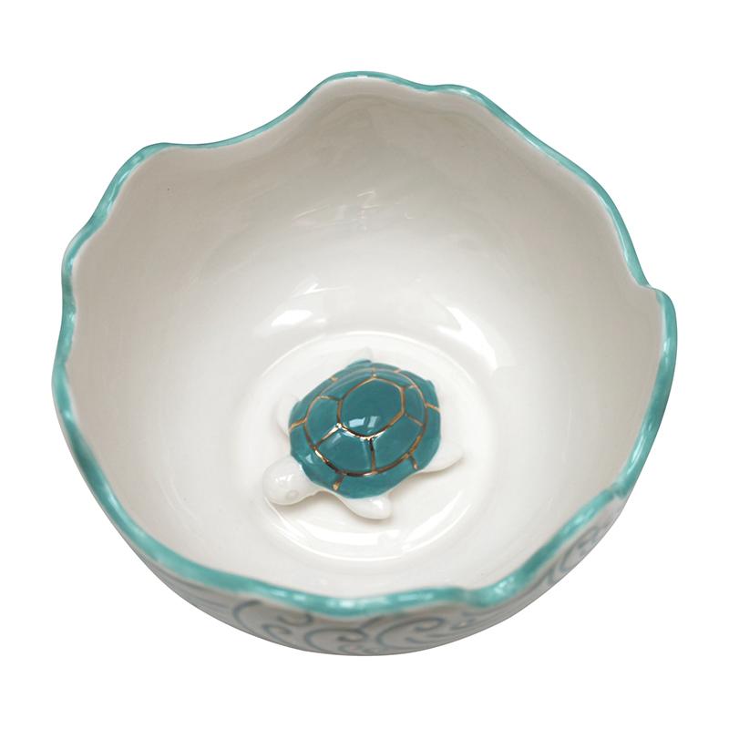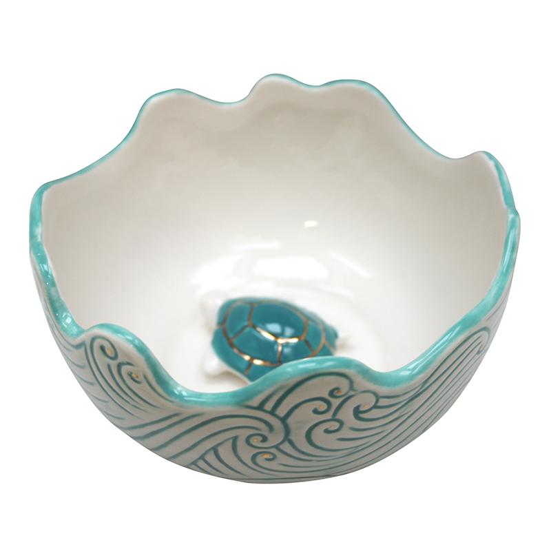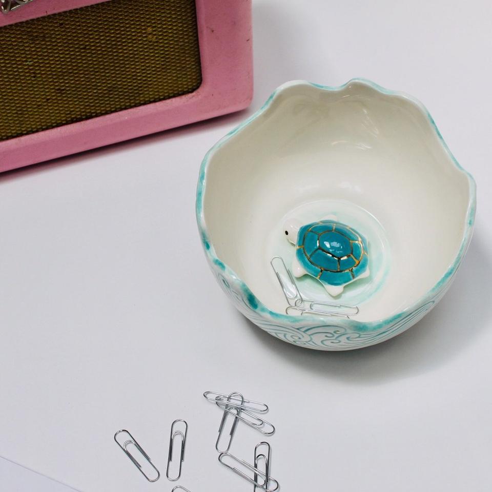 Blue-surf patterned bowl, with gold foil detailing between the waves. Eat up all your breakfast to discover the turtle inside. Arrives safe in a beautifully designed gift box, that is fully lined. Great for dressing table storage or office as well as kitchen.
