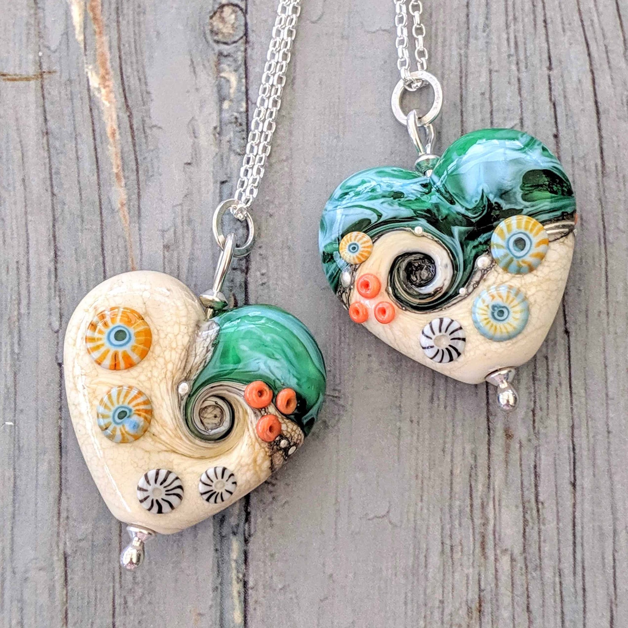 This handmade glass focal heart shaped bead measures approx 30mm wide. It was hand crafted by Julie Fountain at Beach Art Glass. The Sea Spray heart pendant is decorated on both sides and features the trademark swirl. The palest blue gl...