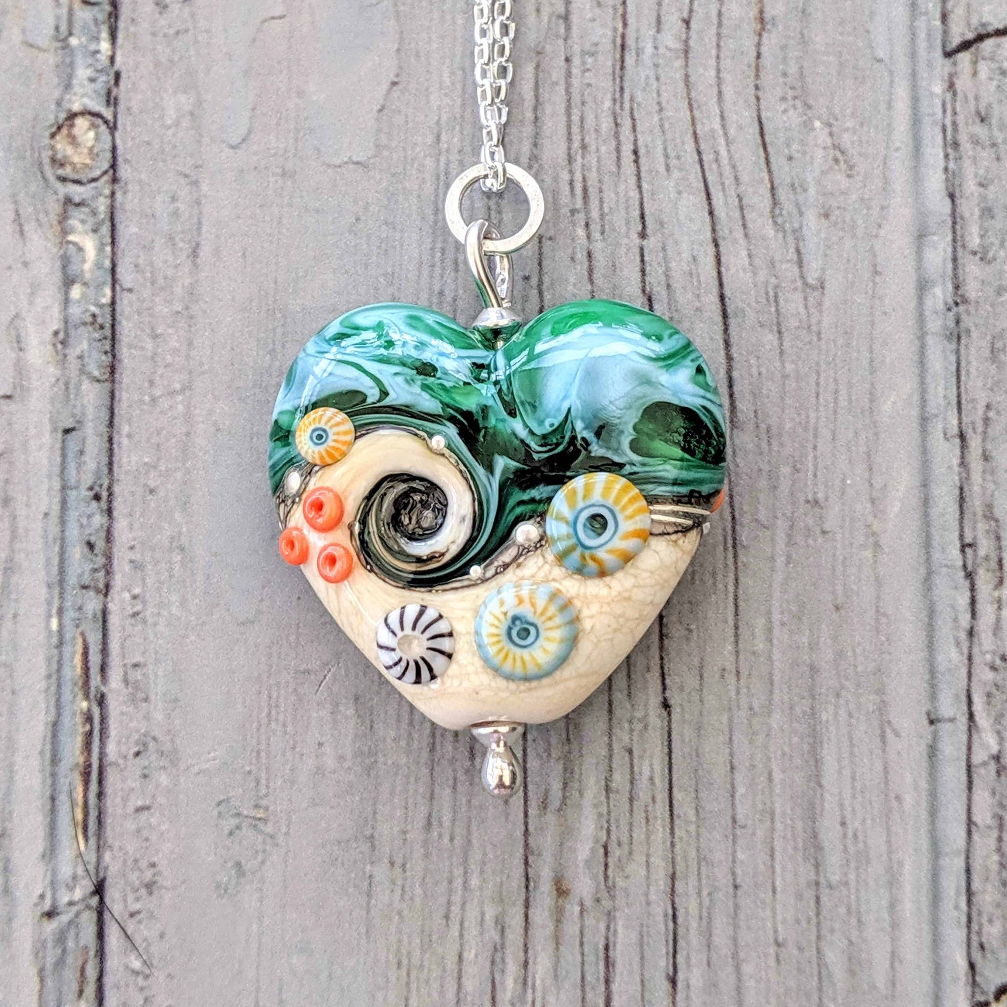 This round domed shape is well-described as a “lentil” and is the bestselling pendant shape. This bead is 28mm wide and hangs on an 18″ sterling silver Belcher chain. The bead is decorated on both sides and all the little beachy details ...