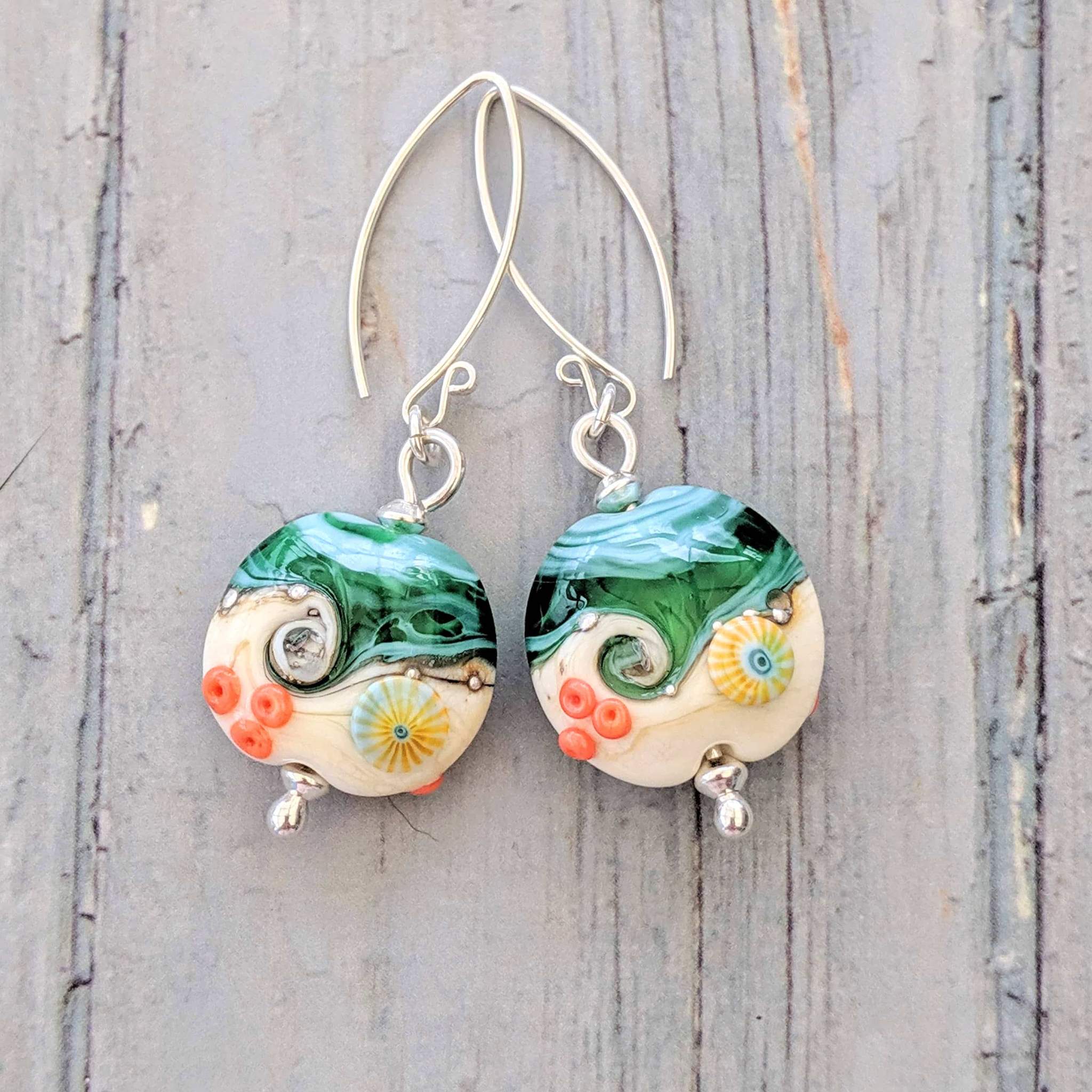 This round, lightly domed shape is aptly described as a “lentil” and has been hand crafted by Julie Fountain at Beach Art Glass. The Sea Spray lentil pendant is decorated on both sides with handmade beachy details and fine silver droplets...