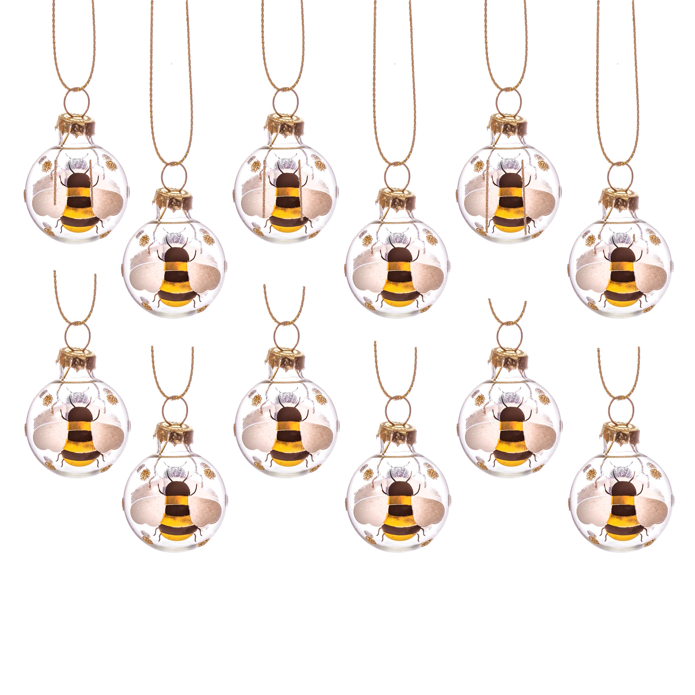 This set of twelve mini baubles are made from glass and feature our beautiful bee design. The iridescent gleam of these decorations highlights the twinkle of Christmas joy.