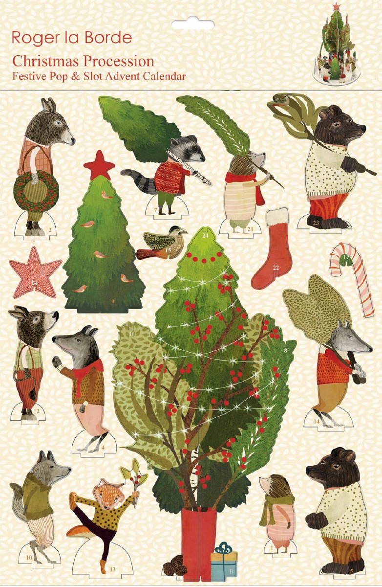 Pop and Slot Advent Calendar from Roger La Borde with artwork by Jane Newland. Contains 3 cardboard punch-out sheets to make a woodland Christmas setting. Construct the magical tree, then find and pop out the enchanting forest creature-of-t...