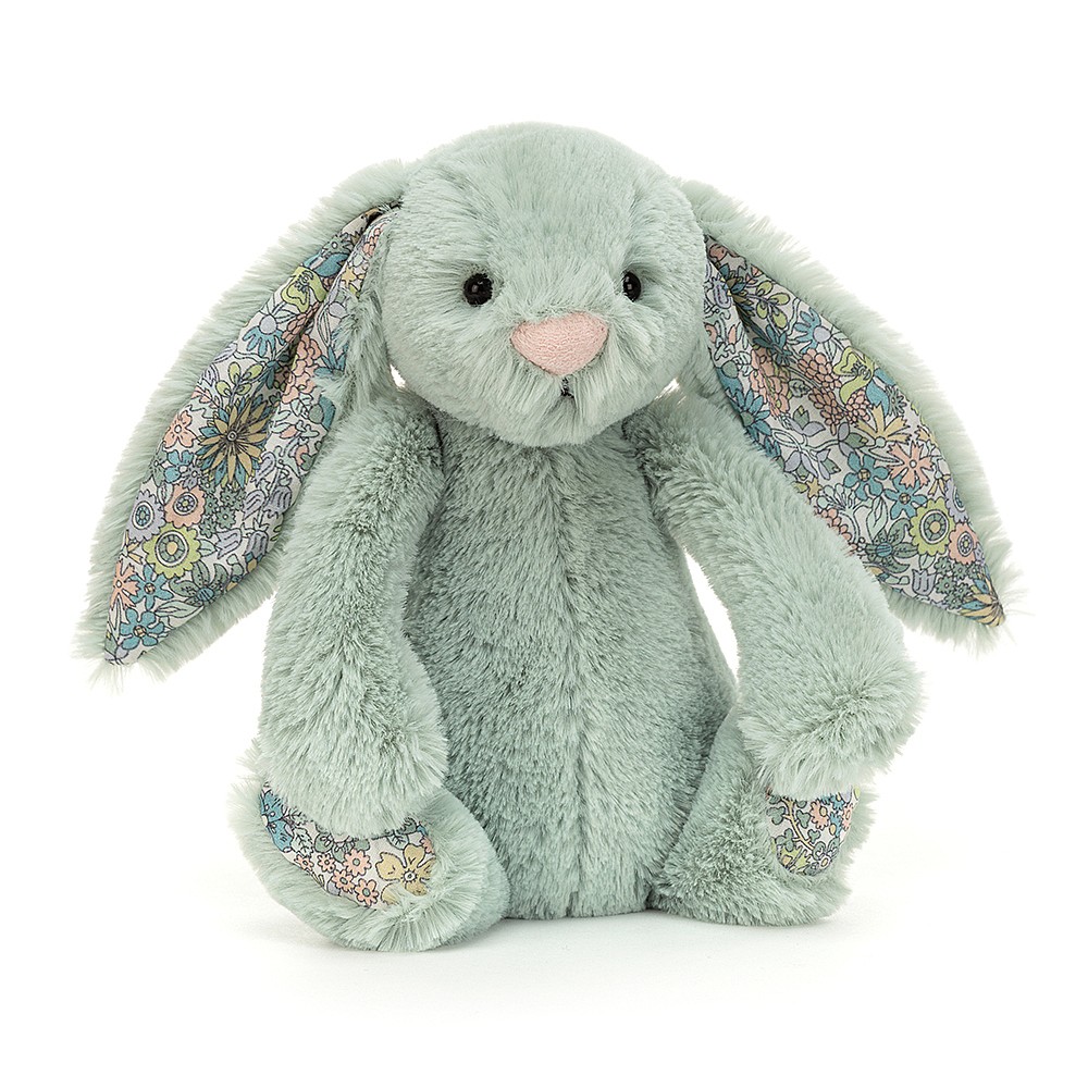 Blossom Sage Bunny has minty, plush fur, and a cotton floral pattern in their ears and on their paw pads. Soft as ice cream, and just as scrumptious!