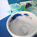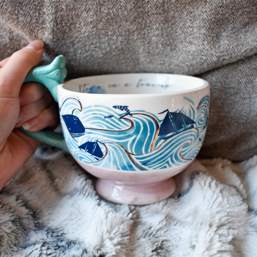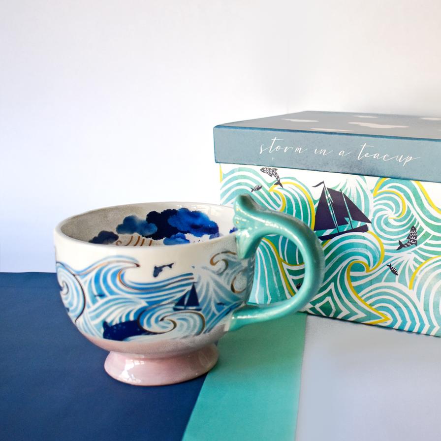House of Disaster By the Sea Stormy Tea-Cup. Features on the outside a stormy, wild-sea print with whales and ships battling the waves. 'Storm in a teacup' and thunder clouds printed on the inside edge. Finish your tea to find the origami boat waiting to be rescued from the bottom. Arrives safe in a matching, beautifully designed gift box.