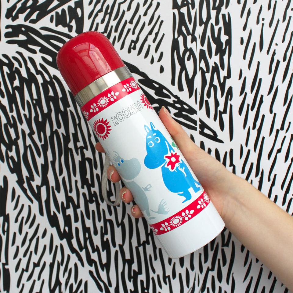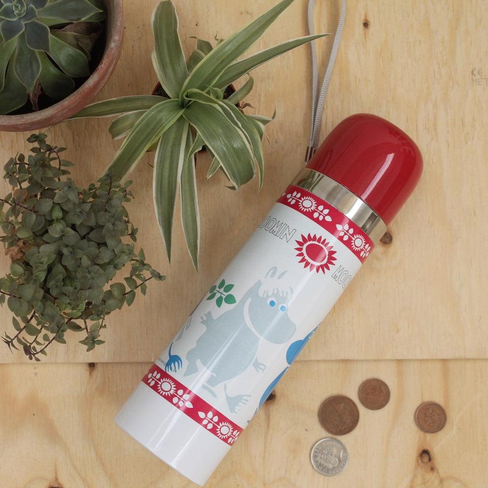 Moomin thermos flask from the 'Spring' range. Features: Lid is also a cup and has a wrists strap. Great for keeping drinks hot or cold.