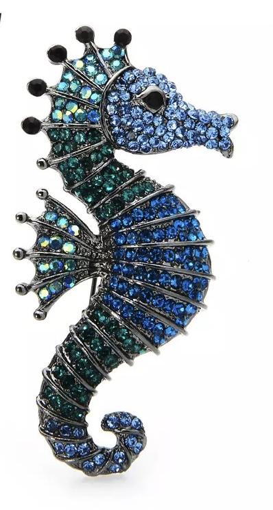 Beautiful metal seahorse brooch with blue and turquoise rhinestones.