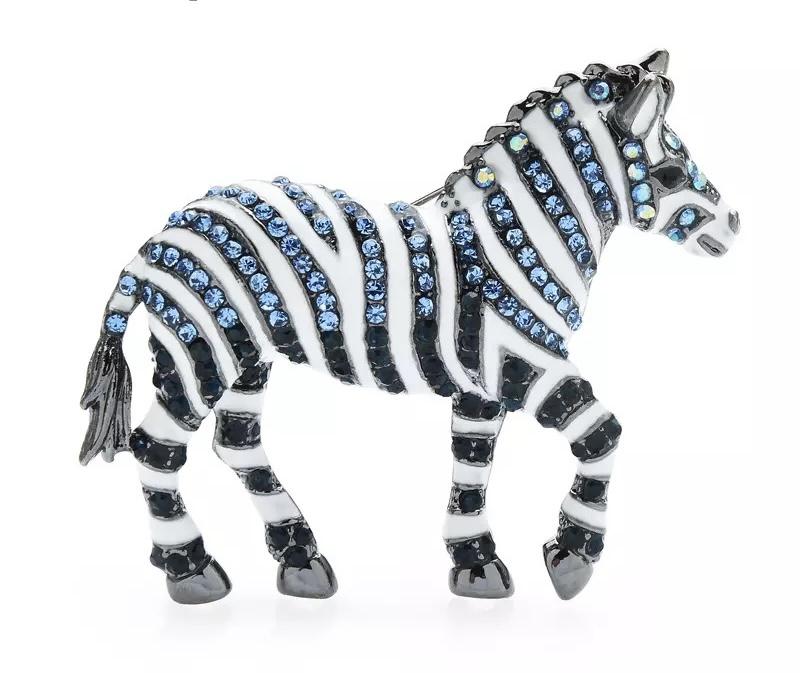 Beautiful metal zebra brooch with black and white enamel and blue rhinestones