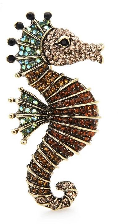 Beautiful metal seahorse brooch with bronze and green coloured rhinestones.